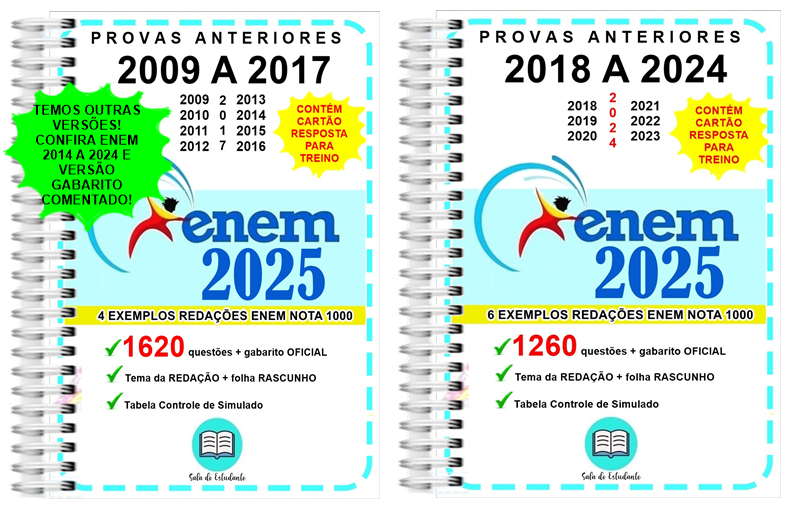 Esse anúncio refere-se a 2 apostilas FÍSICAS (não são produtos digitais) que possuem as provas COMPLETAS (1º e 2º dia de aplicação) do ENEM REGULAR das edições anteriores dos anos de 2009 a 2024 + Gabarito OFICIAL ao final de cada edição.