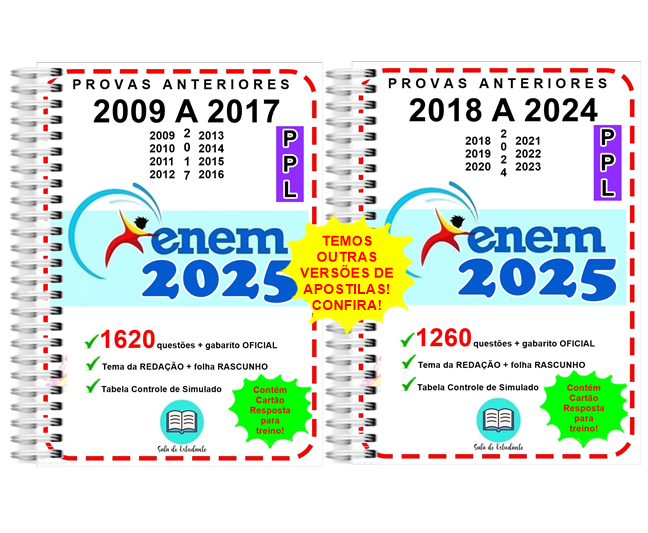Esse anúncio refere-se a 2 apostilas FÍSICAS (não são produtos digitais) que possuem as provas COMPLETAS (1º e 2º dia de aplicação) do ENEM PPL das edições anteriores dos anos de 2009 a 2024 + Gabarito OFICIAL ao final de cada edição. Segue especificações: