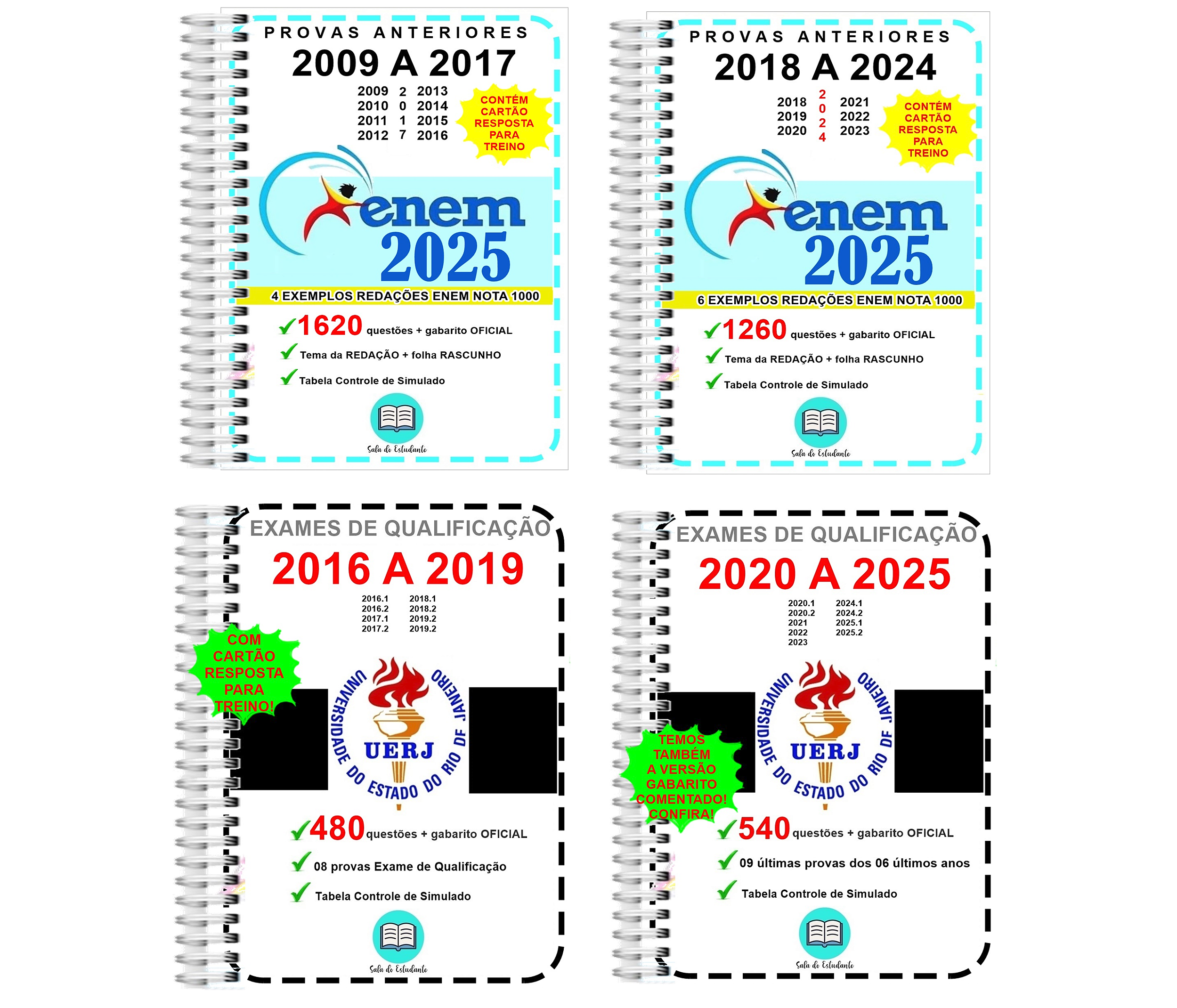 Anúncio refere-se a 04 apostilas; Sendo 2 apostilas ENEM contendo as provas de 2009 a 2023 com gabarito OFICIAL + 2 apostilas UERJ Exames de Qualificação (1ª Fase) contendo as edições de 2016 a 2025 (1º e 2º exames) + gabarito OFICIAL ao final. Trata-se um material FÍSICO (não é arquivo digital). Segue especificações: