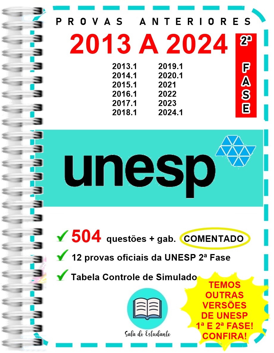 Esse anúncio refere-se a UMA apostila contendo as provas anteriores do vestibular UNESP 2ª FASE das edições 2013 a 2024 + gabarito COMENTADO ao final de cada edição. Trata-se um material FÍSICO (não é arquivo digital). Segue especificações: