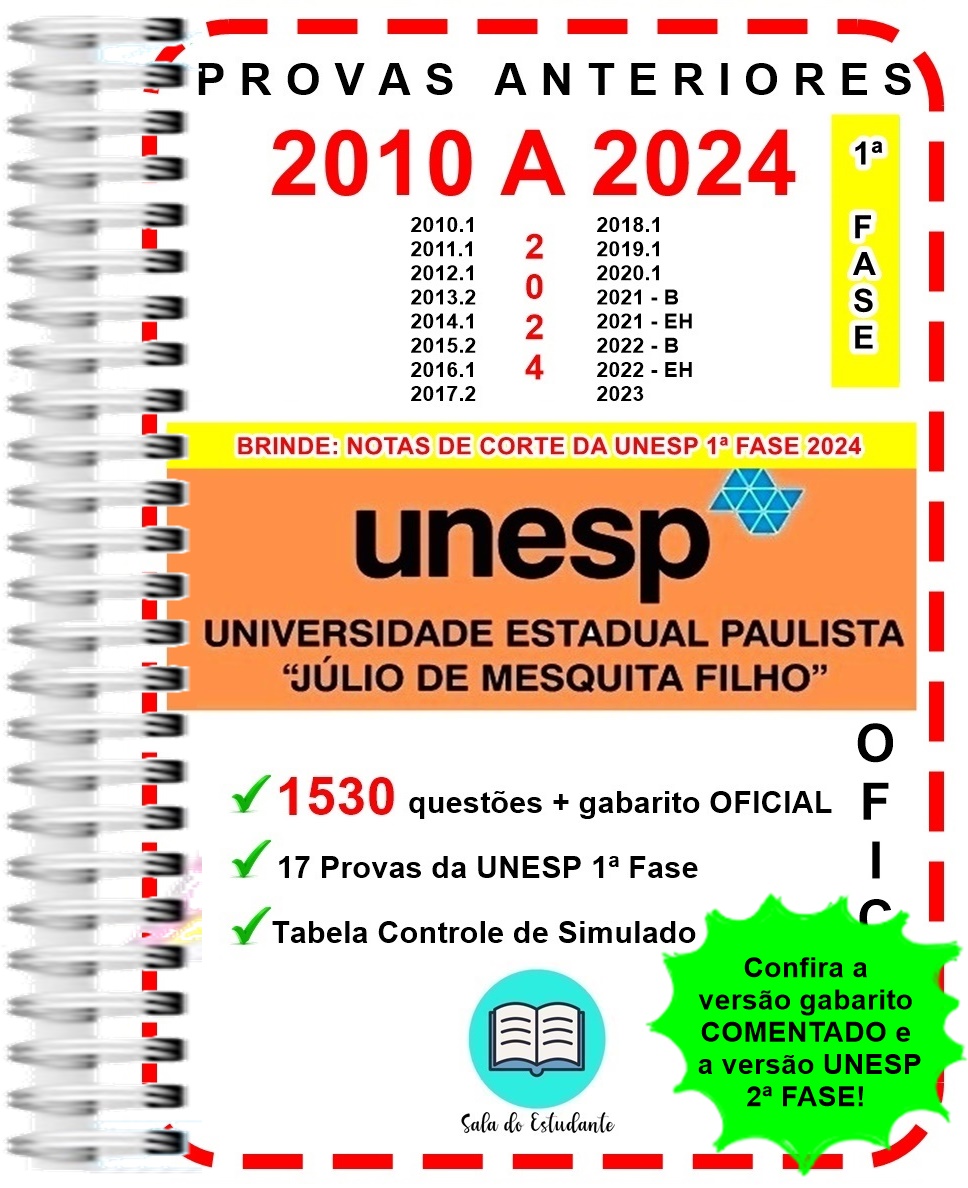 Esse anúncio refere-se a 1 apostila contendo provas da UNESP 1ª Fase das edições 2010 a 2024 + gabarito OFICIAL ao final de cada edição. Trata-se de um material FÍSICO (não é arquivo digital). Segue especificações: