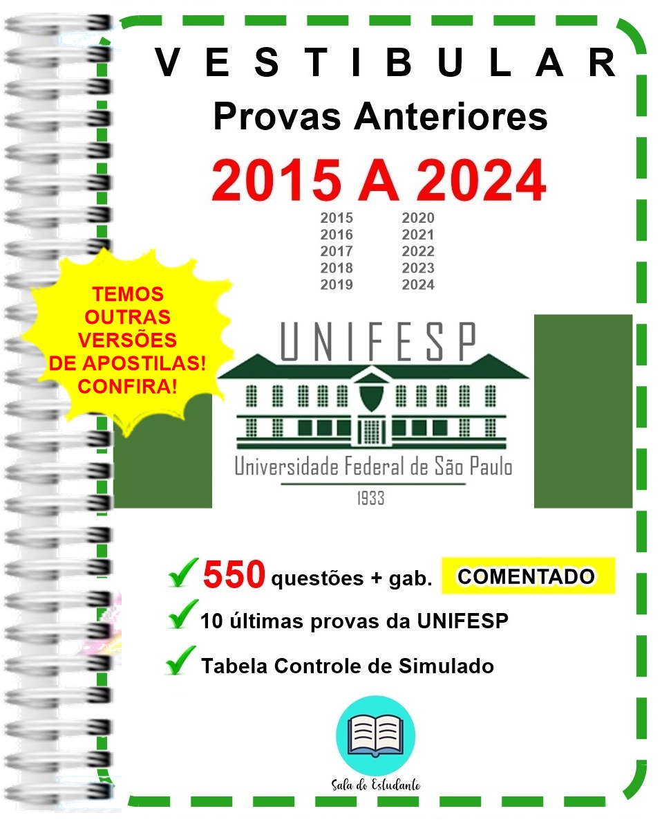 Apostila possui as provas do UNIFESP das edições anteriores dos vestibulares de 2015, 2016, 2017, 2018, 2019, 2020, 2021, 2022, 2023 e 2024 + Gabarito COMENTADO de TODAS as questões realizada pelos principais cursinho pré-vestibulares.